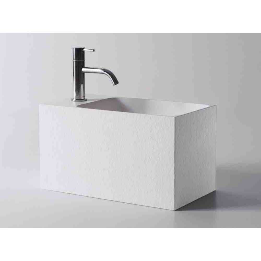 Idealny do małych pomieszczeń, idealny do łazienek dla gości lub drugorzędnych środowisk, wszechstronny, ponieważ można go zawiesić na długim lub krótkim boku. Calco to zlew o prostokątnym kształcie i zaokrąglonych rogach, wykonany w całości z Flumood w wykończeniu tekstury. Kontrast między gładką umywalką a nieregularną zewnętrzną stroną podkreśla wrażenie rzeźby wyrzeźbionej z szorstkiego bloku lub matrycy, z której można wydobyć ręcznie wykonany artefakt.