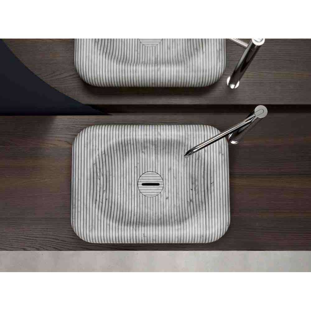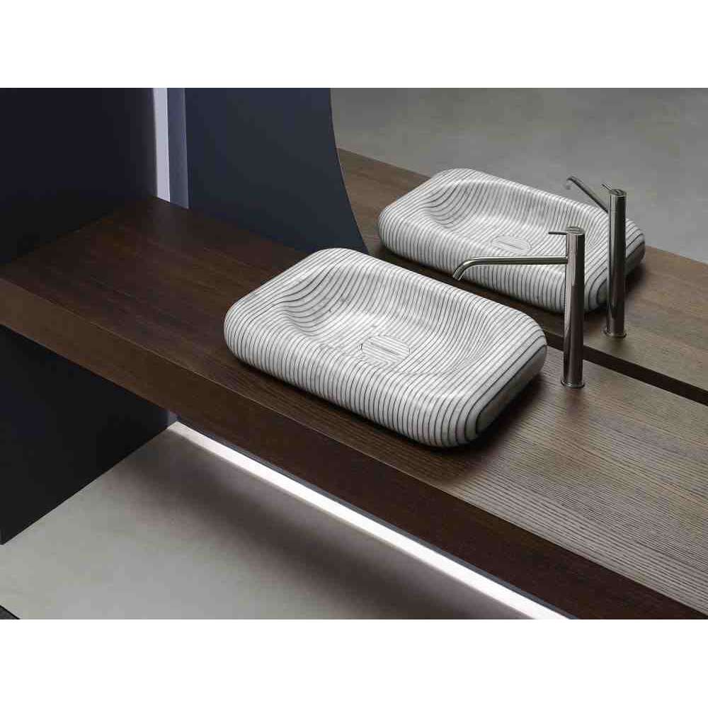 Okrągłe, owalne lub kwadratowe, Gessati wnosi do łazienki energię i osobowość dzięki równoległym liniom biegnącym po zakrzywionych powierzchniach, definiując nowe perspektywy i kierunki. Niezwykła osobowość marmuru i jego nieskończone wariacje chromatyczne sprawiają, że każda umywalka jest wyjątkowa i niepowtarzalna.