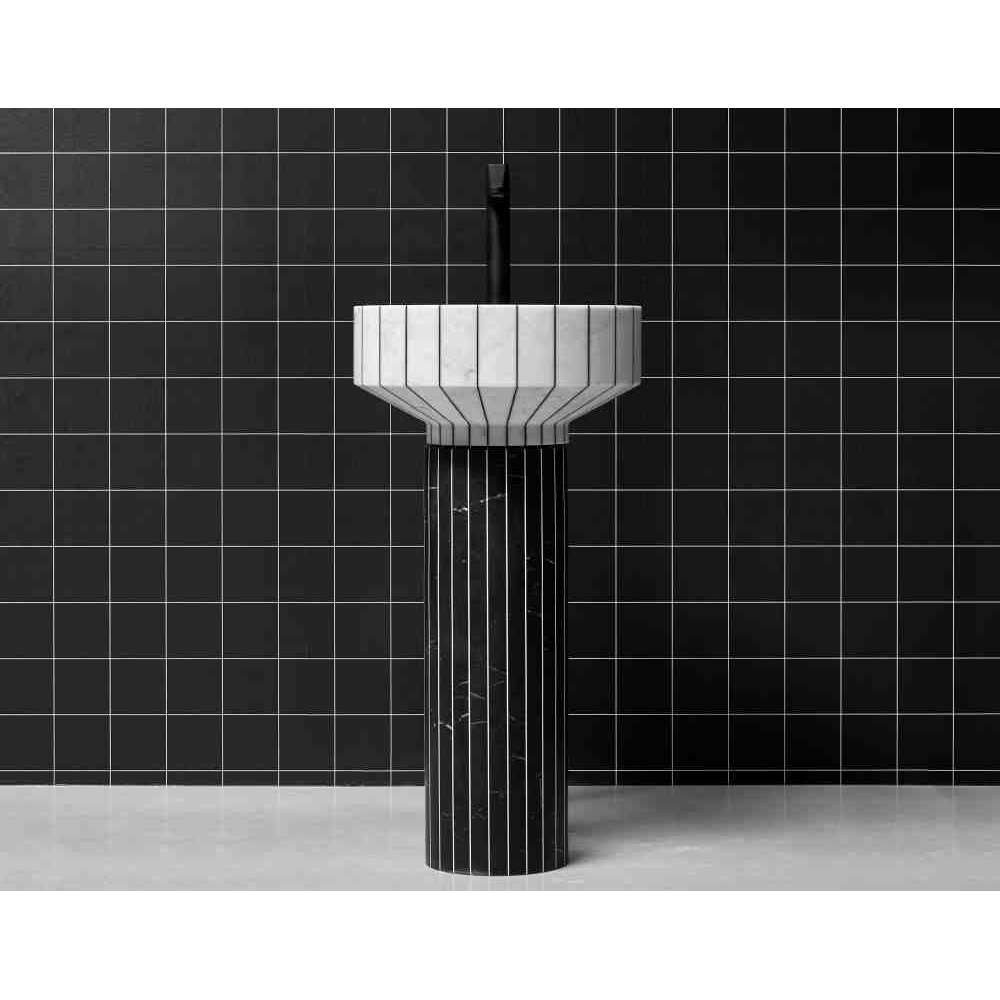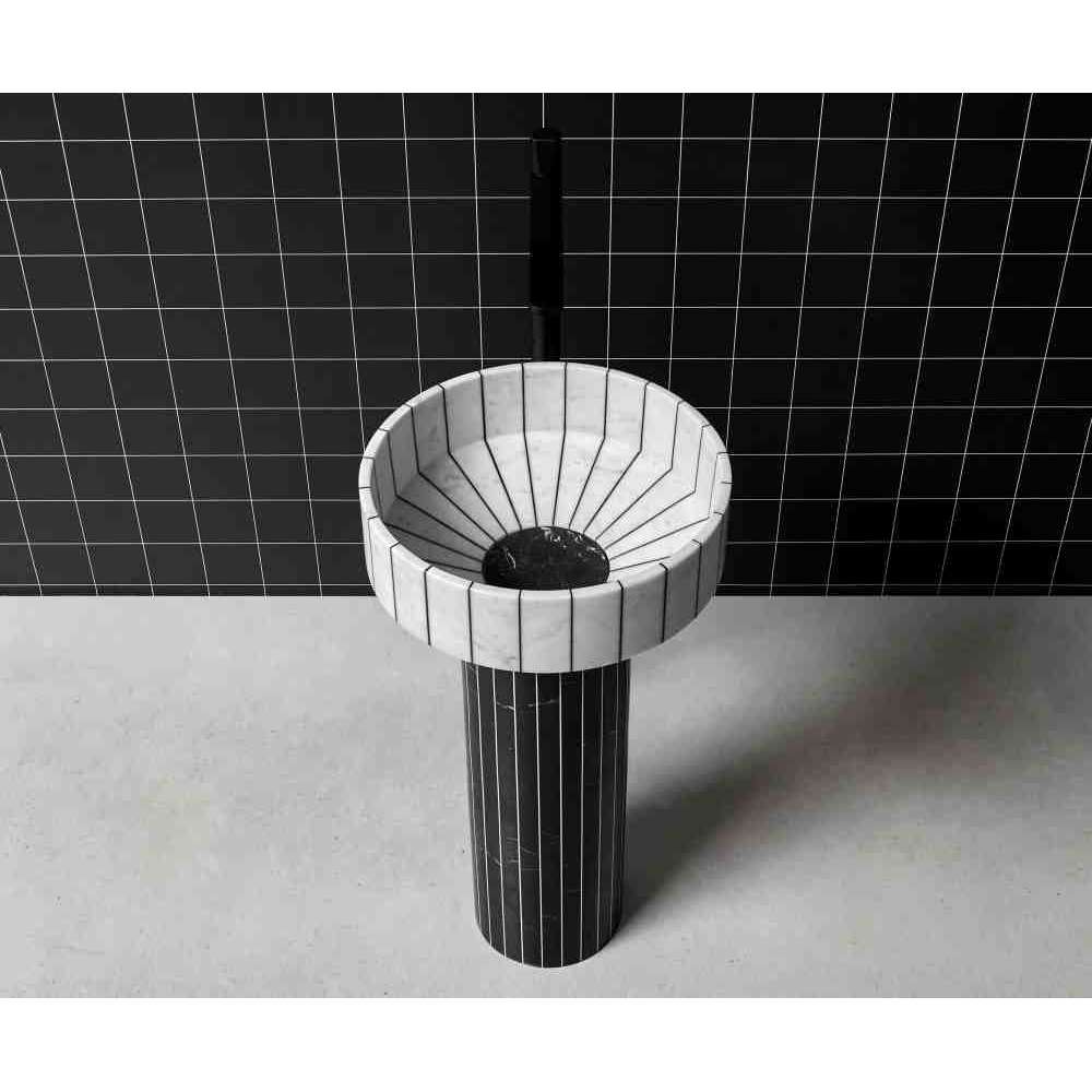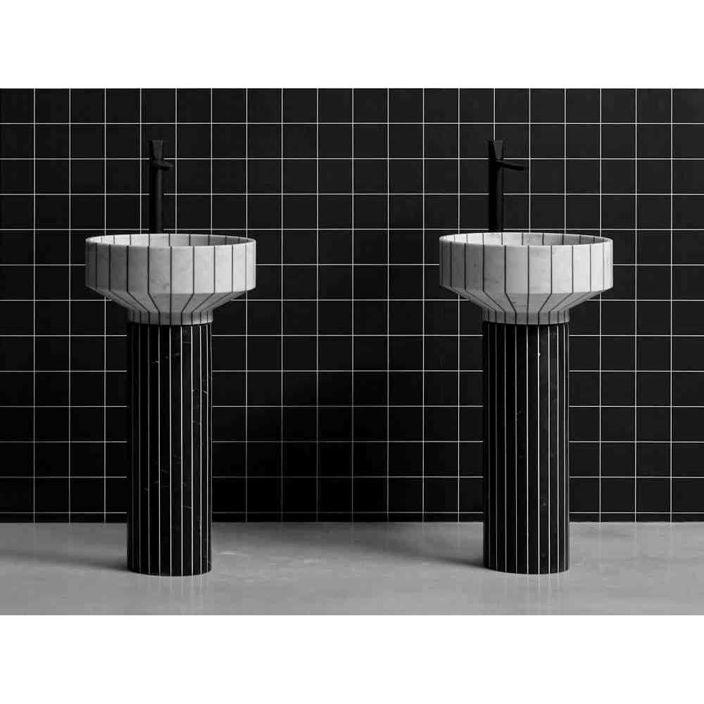 O24 to wolnostojąca umywalka marmurowa wykonana z 24 segmentów marmuru sklejonych żywicą w kontrastowym kolorze. 024 został zaprojektowany z uwzględnieniem aspektów związanych ze zrównoważonym rozwojem środowiska i wykorzystaniem materiałów pochodzących z recyklingu. Ten zlew, wraz z Gessati i Rigati, jest częścią kolekcji Tra_Le_Righe firmy Gumdesign dla antoniolupi.