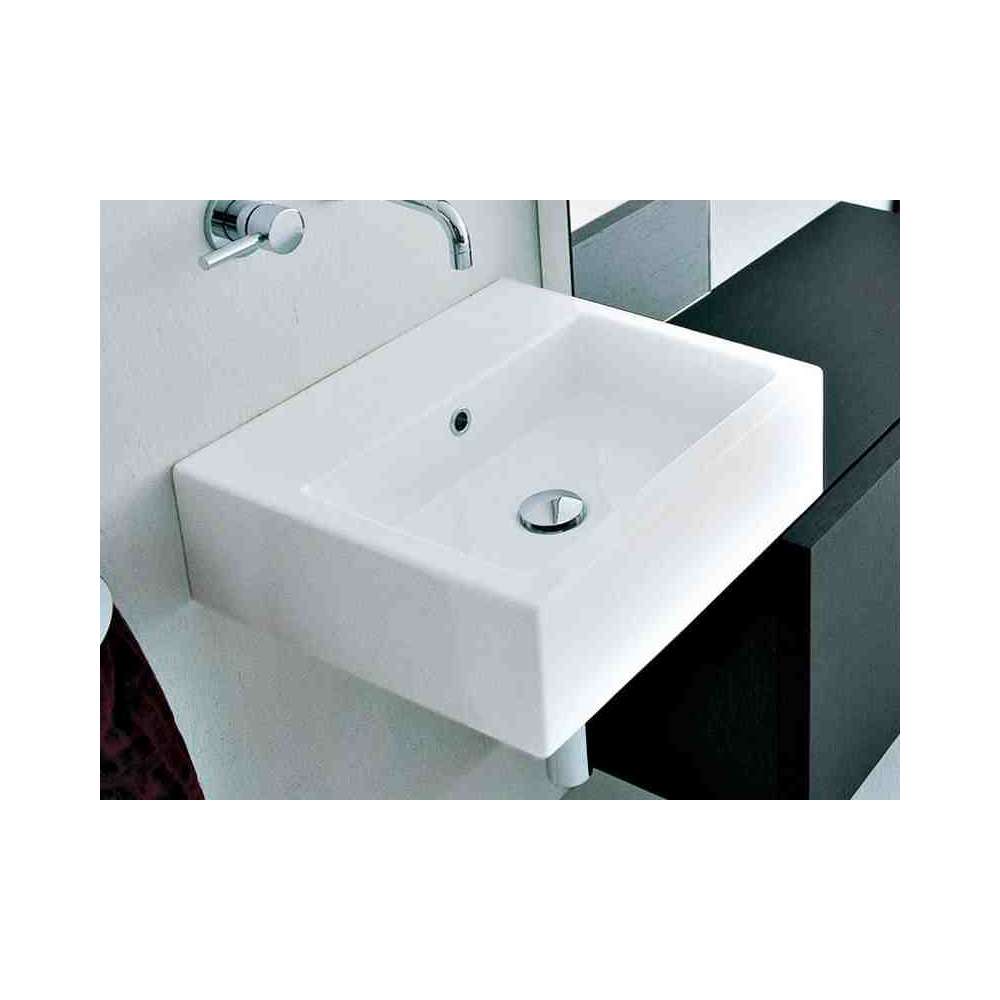Prostokątna ceramiczna umywalka wisząca / nablatowa. Z listwą na baterię umieszczoną na trzy otwory. Z przelewem