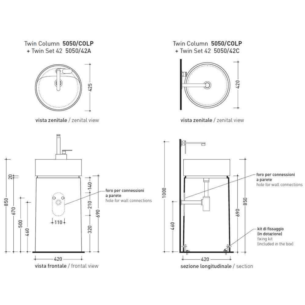 Seria Twin składa się z okrągłych umywalek, w różnych modelach i dwóch rozmiarach: umywalka, półwpuszczana, podblatowa, z półką na baterię lub bez, ławka i zawieszana na ścianie dzięki specjalnym wspornikom ściennym i narożnym do tworzyć wiele różnych aranżacji. Asortyment uzupełnia kilka małych umywalek Mini Twin, idealnych do niewielkich przestrzeni, dostępnych w trzech wersjach: stołowej, narożnej i wiszącej. Twin Column, stworzona dla umywalki Twin Set 42, jest symbolem kolekcji; prawdziwą innowacją jest wolnostojąca kolumna. Podwójna kolumna obejmuje i dominuje w całej przestrzeni wokół niej; jako prawdziwy domowy fontanna staje się bohaterem łazienki odrywającej się od tradycyjnych schematów i konwencjonalnej estetyki.