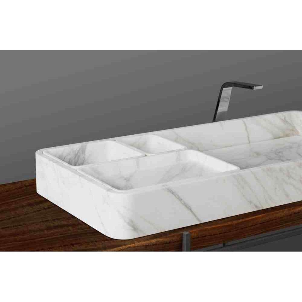 Bento to marmurowa umywalka nablatowa, charakteryzująca się kompozycją pięciu wymiennych i wyjmowanych marmurowych elementów.