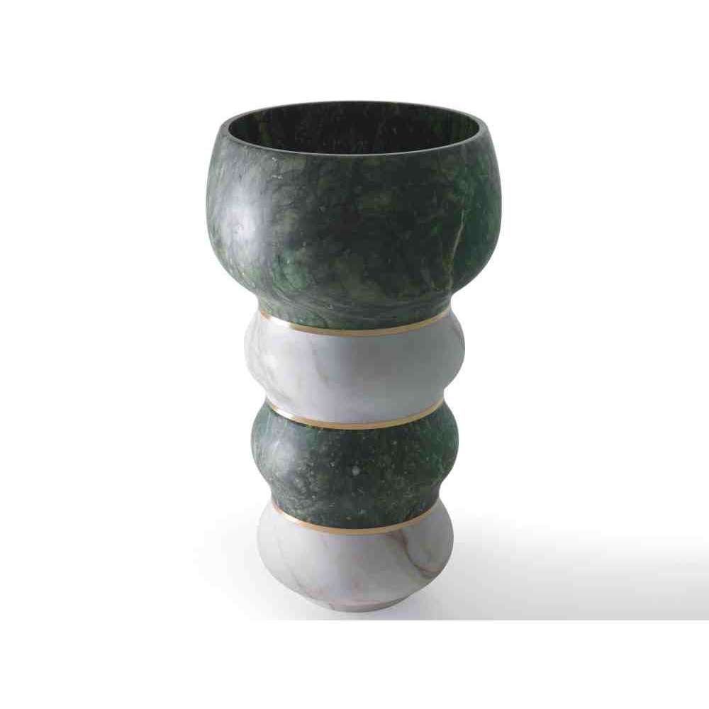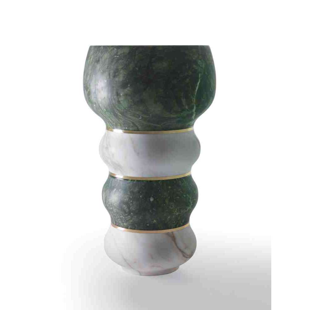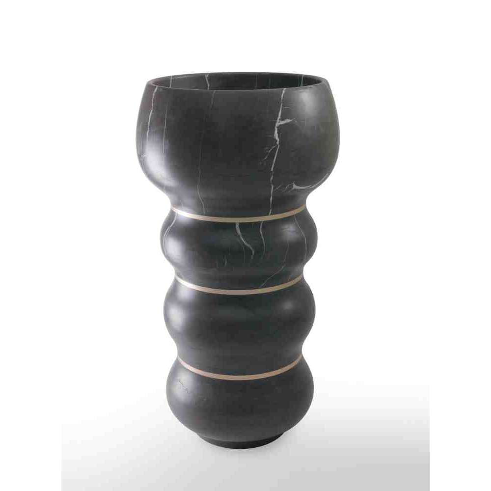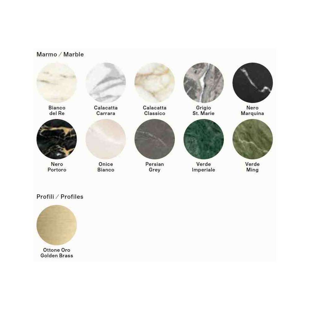 Metalowa wstawka, dopracowany detal, funkcjonuje zarówno jako element zróżnicowania, jak i ciągłości. Ta cecha konstrukcyjna pozwala również na bardziej wydajną produkcję, ponieważ element można wyrzeźbić z mniejszych bloków kamienia, co zmniejsza straty materiału. Ta modułowa produkcja otwiera nowe możliwości twórcze. Różne kolory i faktury marmuru można łączyć w jednym kawałku, tworząc intrygujące zestawienia w nakładaniu się kształtów i materiałów.