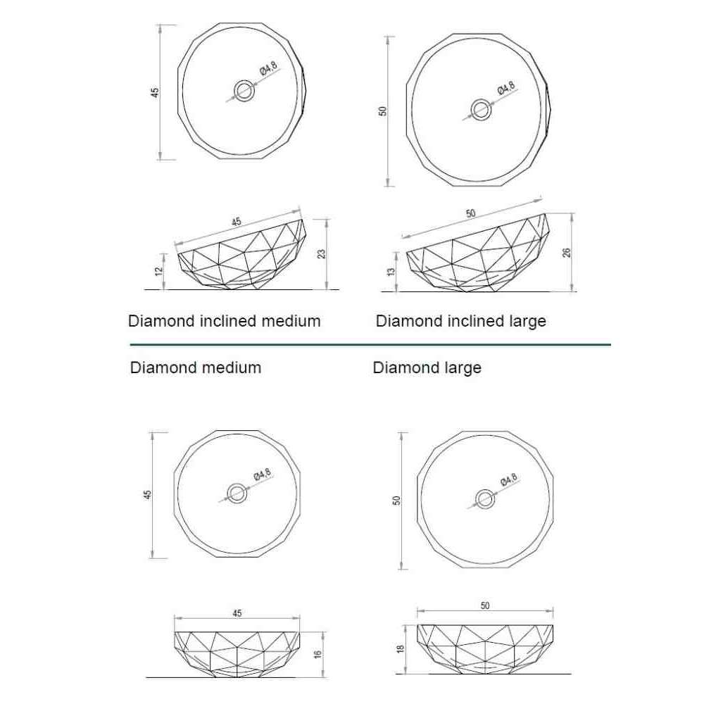 Dostępny w różnych kolorach, Diamond występuje w dwóch rozmiarach, średnica 50 cm i 18 wysokości, 45 cm średnicy i 15 wysokości.