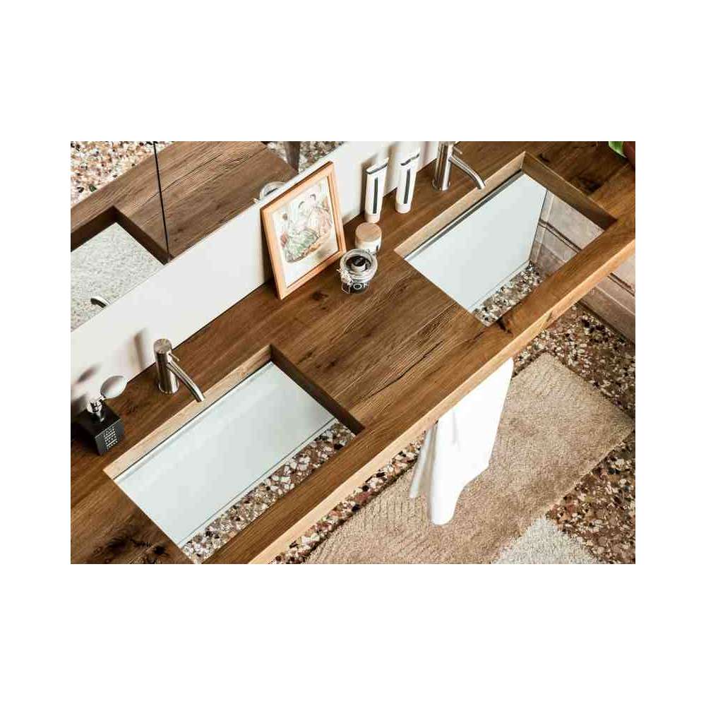 Przezroczyste okno wody utworzone z półki o grubości 8 cm. Umywalka Depth bawi się uczuciem pustej, otwartej pustki z pochylonym dnem z przezroczystego szkła. Wildwood, wykonany z wielowiekowego dębu o rzeźbionym usłojeniu, idealnie dopasowuje się do przestrzeni i tworzy elegancką powierzchnię. Materiał został poddany obróbce cieplnej, dzięki czemu jest wysoce odporny na działanie płynów w celu odnowienia przyczepności. Dostępny z pojedynczą lub podwójną umywalką.