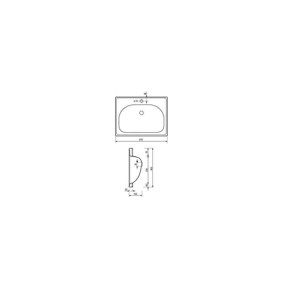 Umywalka prostokątna z otworem na baterię ø 35 i otworem przelewowym (w komplecie z przyłączem do mocowania odpływu).