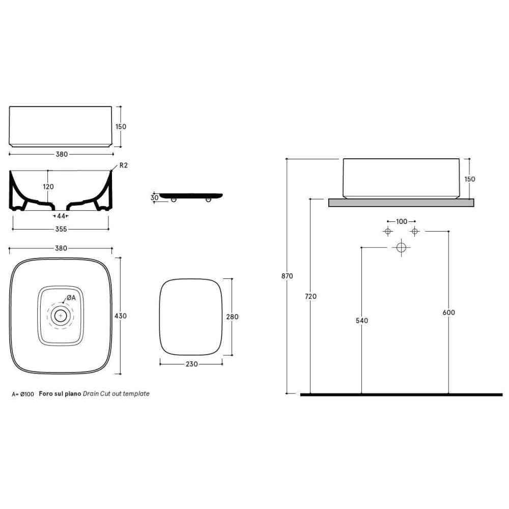 b) Acquerello è un lavabo rettangolare in ceramica senza troppopieno. Tavolozza della copertura dei rifiuti.