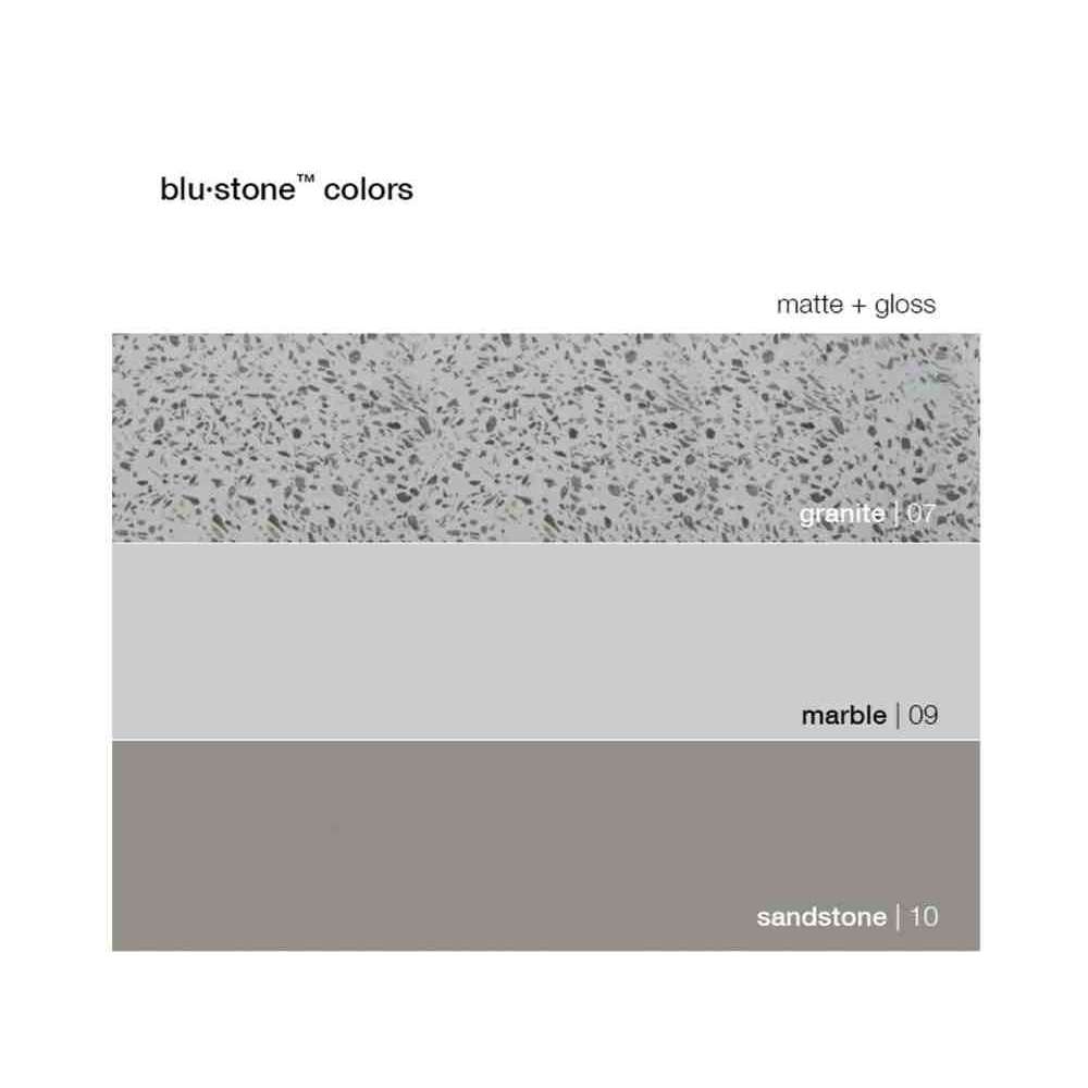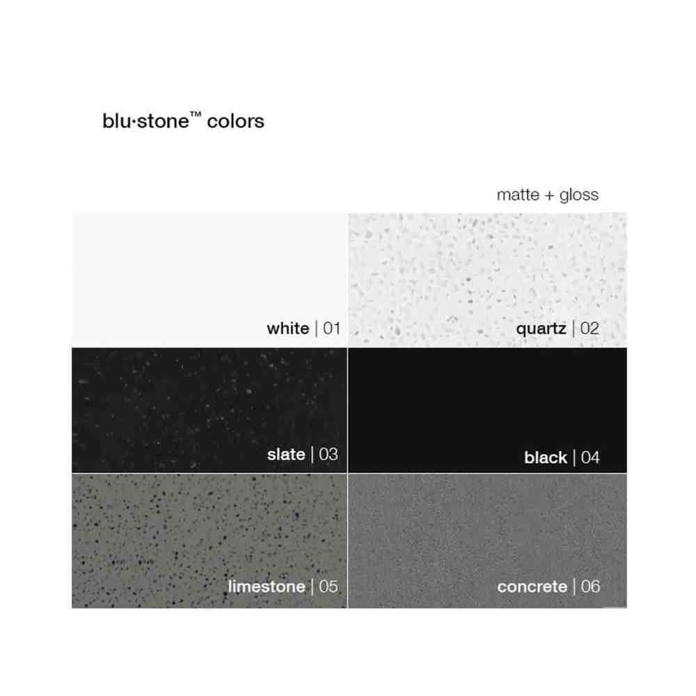 Wykonany z kwarcytu i biożywicy, blu∙stone™ to wyjątkowo trwały materiał, który wygląda i w dotyku przypomina naturalny kamień. Jest formowany wtryskowo pod wysokim ciśnieniem, antybakteryjny i nieporowaty. Łatwe w utrzymaniu i naprawialne, blu∙stone™ są odporne na plamy i zarysowania.
