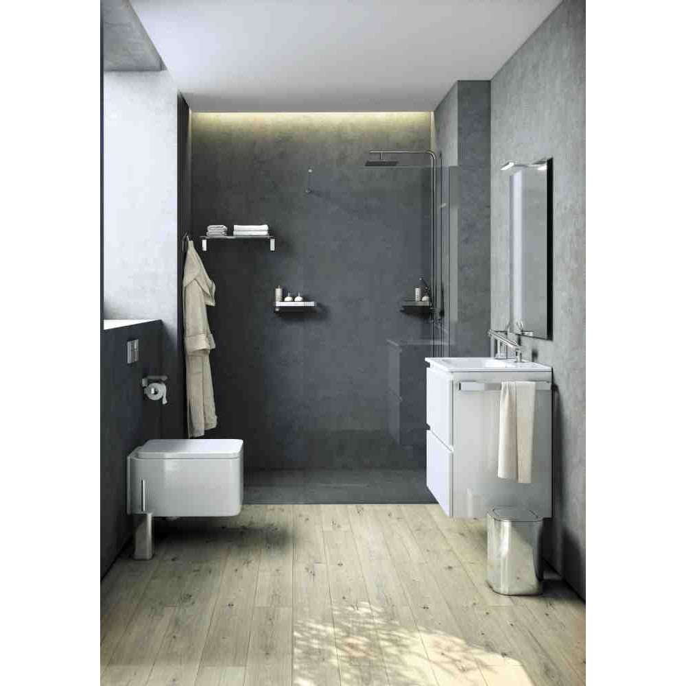 Pierwotny kształt powtarza się w całej gamie, dzięki czemu kwadrat elementów wolnostojących, takich jak kosz na śmieci czy szczotka do toalety, wygładza ich linie o zaokrąglonych kątach.