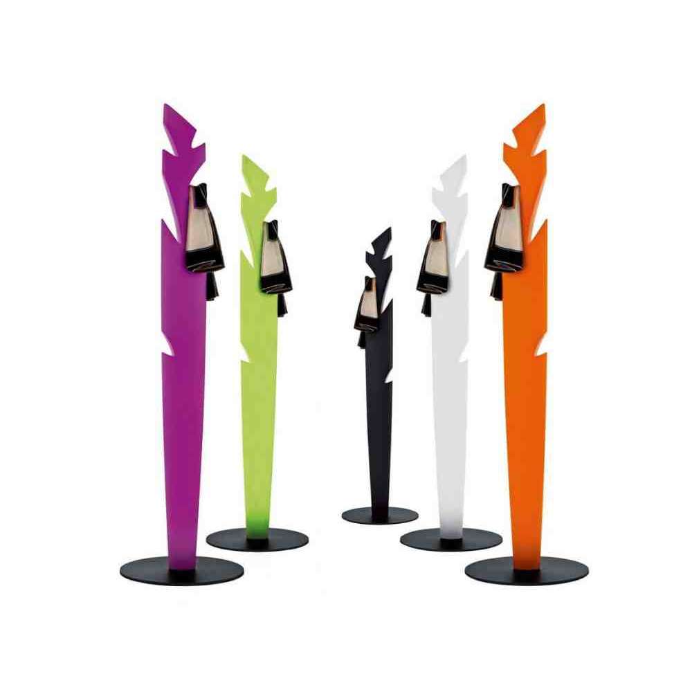 Zabawa kształtami i kolorami, przy użyciu zaawansowanych materiałów, zaprojektowanych tak, aby były przyjemne w dotyku i trwałe. Oddanie świeżego, młodego, kolorowego i oryginalnego uczucia w przedmiocie codziennego użytku. Cleobrings to wszystko w przyjemny i zaskakujący sposób. Polietylen to przezroczysty plastik, który można poddać recyklingowi. Dzięki swoim właściwościom doskonale przybiera pożądany kształt, ograniczając jedynie wyobraźnię. Cleo jest wyrzeźbiona z kilkoma wgłębieniami przypominającymi kształt paszczy rekina. Jako totem wznosi się na wysokość (mierzy 185 cm.) i bardzo dobrze spełnia swoją funkcję i dodaje zabawy. Owalna podstawa wykonana z metalu o wymiarach 47x27 cm. i jest pomalowany na kolor antracytowo-szary. Cleo można wybrać w 5 kolorach: białym, czarnym, pomarańczowym, zielonym lub fioletowym. Świetny pomysł do pokoju nastolatka, można go zaadoptować w każdym innym nieformalnym otoczeniu, w domu, w biurze czy w miejscu publicznym.