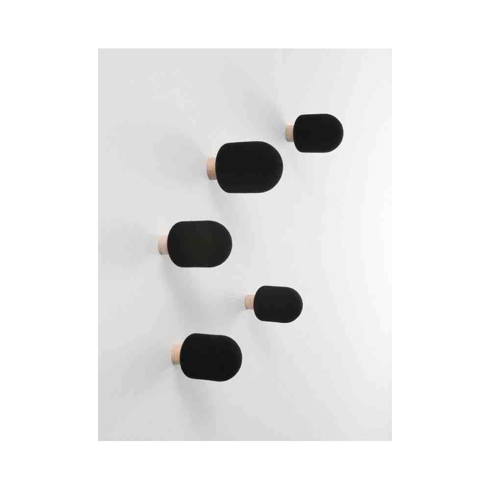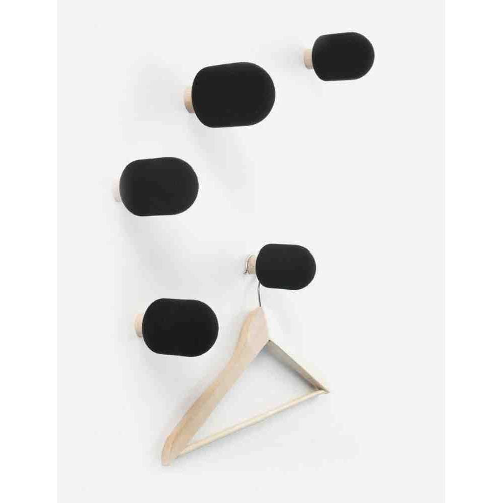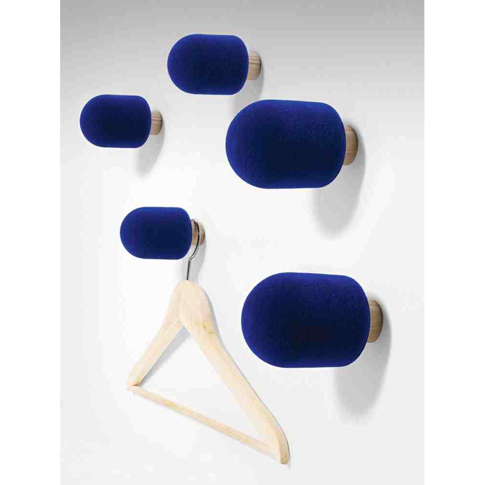 Nawiązując do mikrofonu dziennikarza, dębowe i kolorowe kołki piankowe Micro mocowane są bezpośrednio do ściany, dzięki czemu można na niej delikatnie powiesić ubrania.