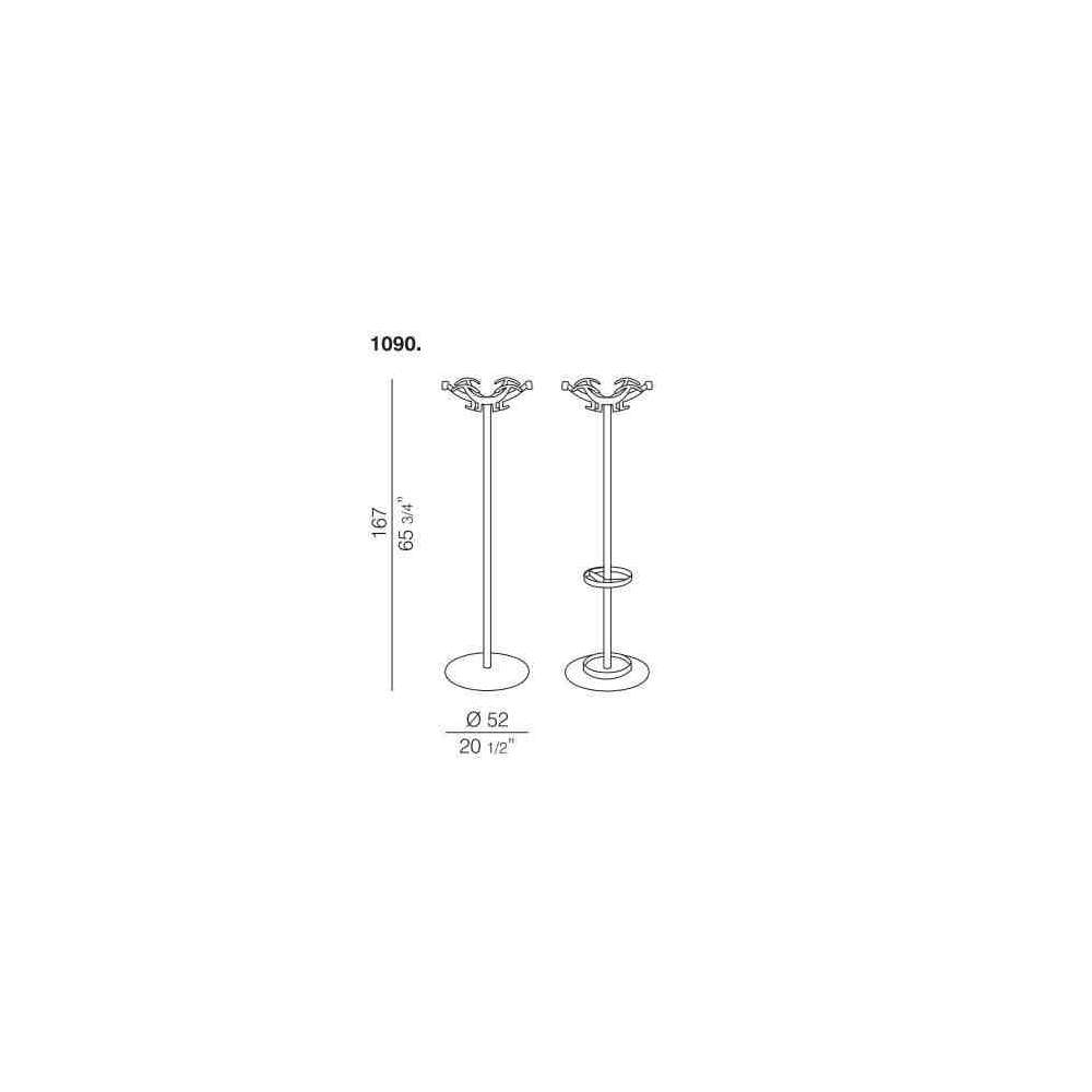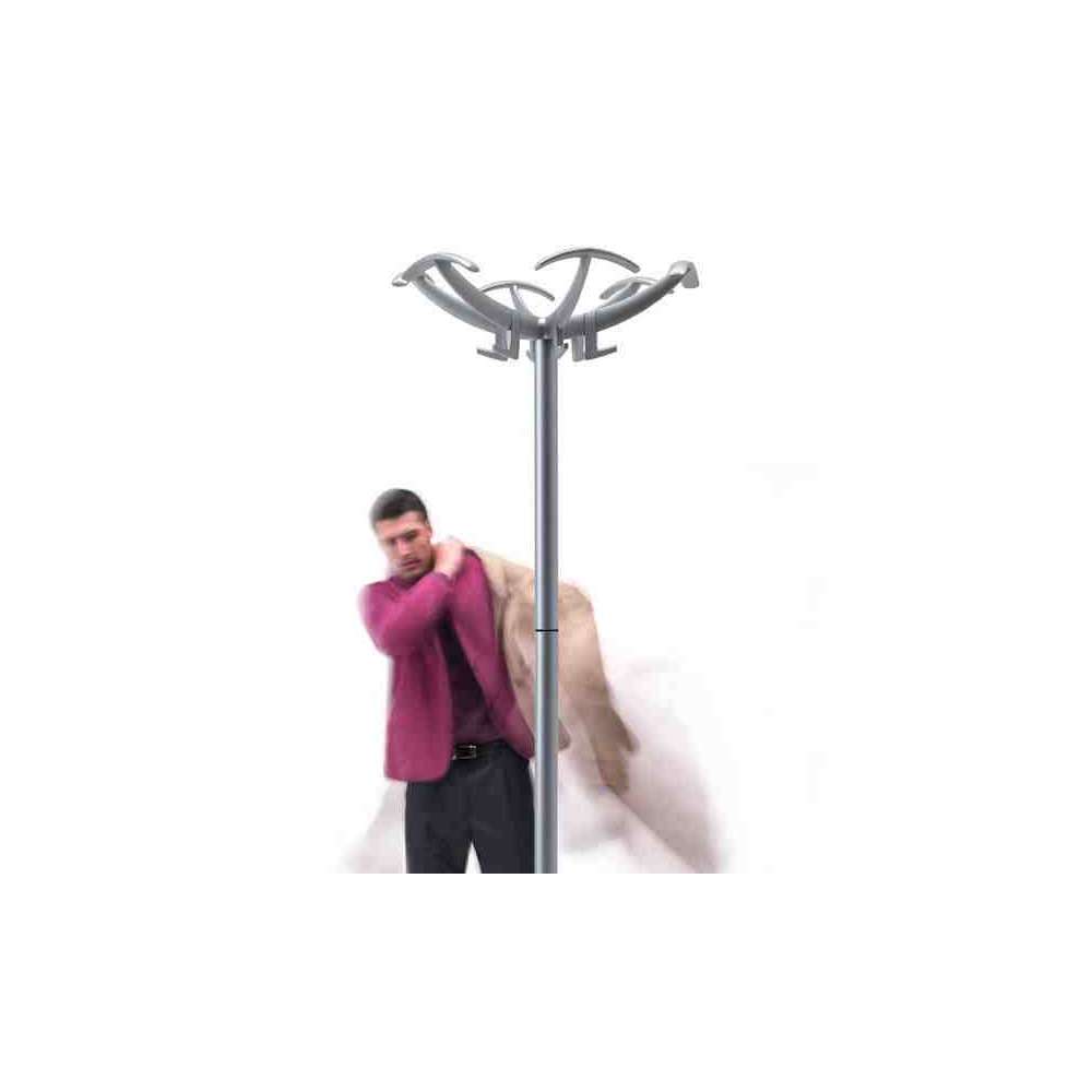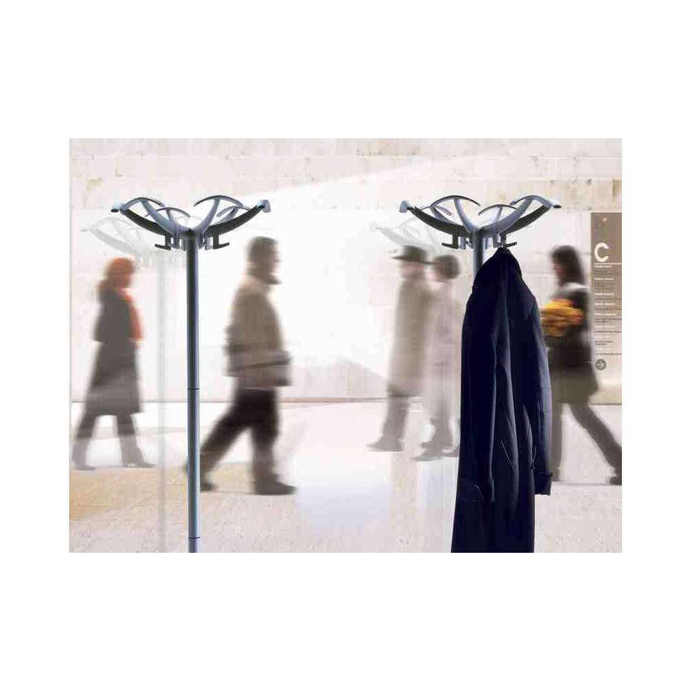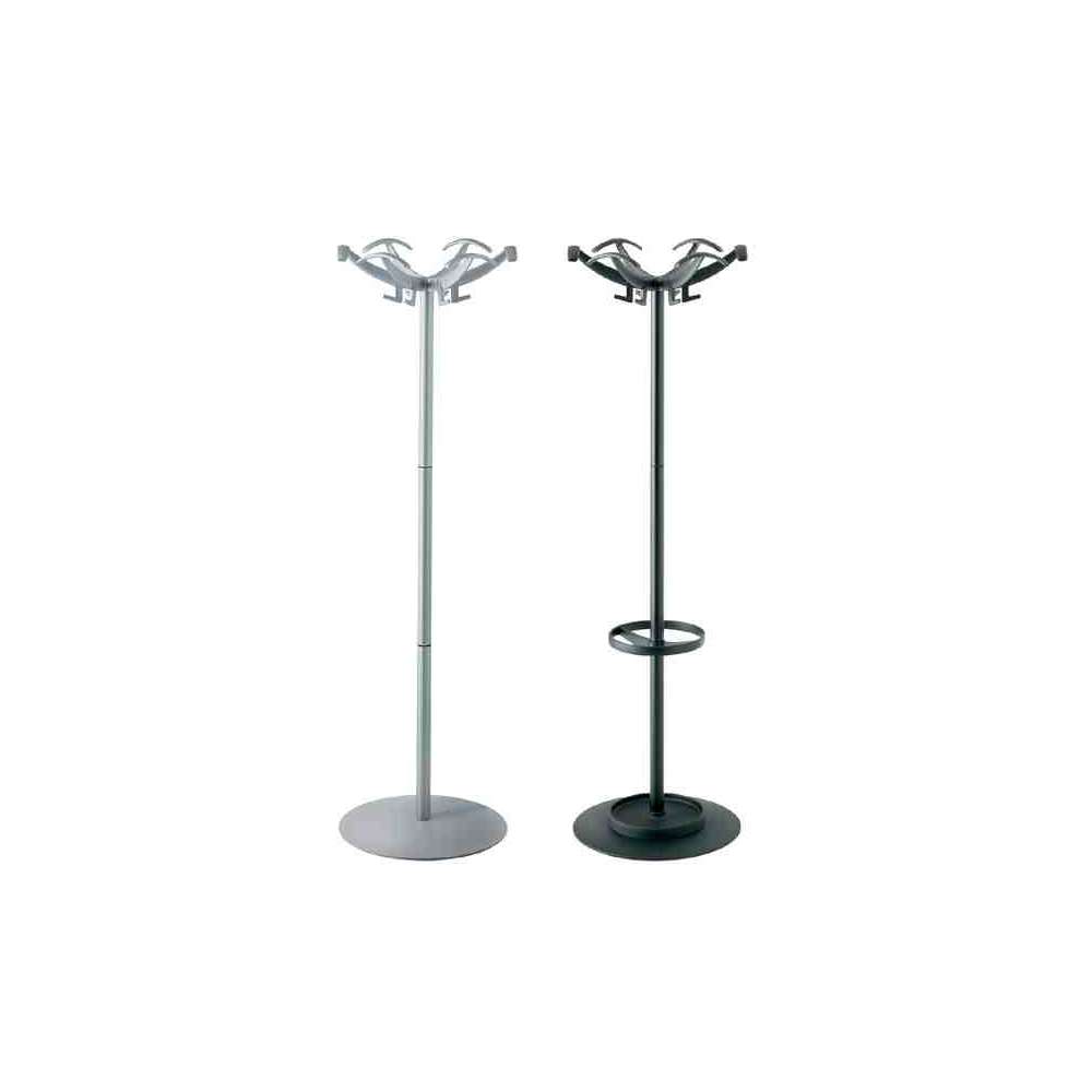 DOPPIOPETTO - Imponujący i szykowny wieszak na płaszcze wyposażony w obszerne podpórki na płaszcze. Opcjonalny stojak na parasole z pierścieniem i taca. Głowica wykonana z polimeru technicznego, noga ze stali lakierowanej, podstawa stalowa z osłoną z polimeru technicznego. Dostępne z wykończeniem aluminiowym lub czarnym matowym.