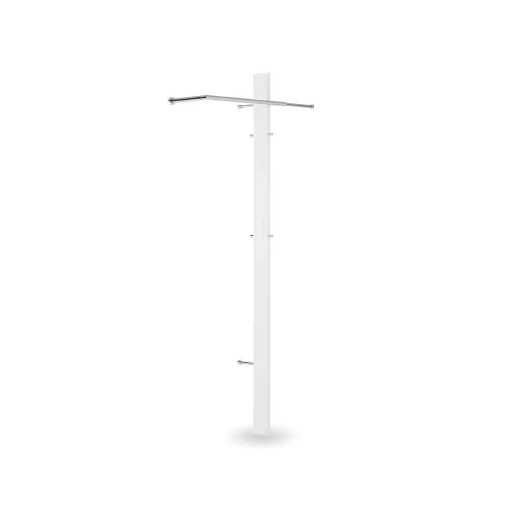 Wieszak ścienny ze stali nierdzewnej MISTER T zapewnia dużo miejsca na wieszaki, które można umieścić po lewej, prawej stronie lub z boku stojaka. Cztery dodatkowe haczyki zapewniają więcej miejsca do wieszania ubrań. W razie potrzeby można dodać uchwyt na parasol z tacką ociekową wykonaną z grubościennego szkła.