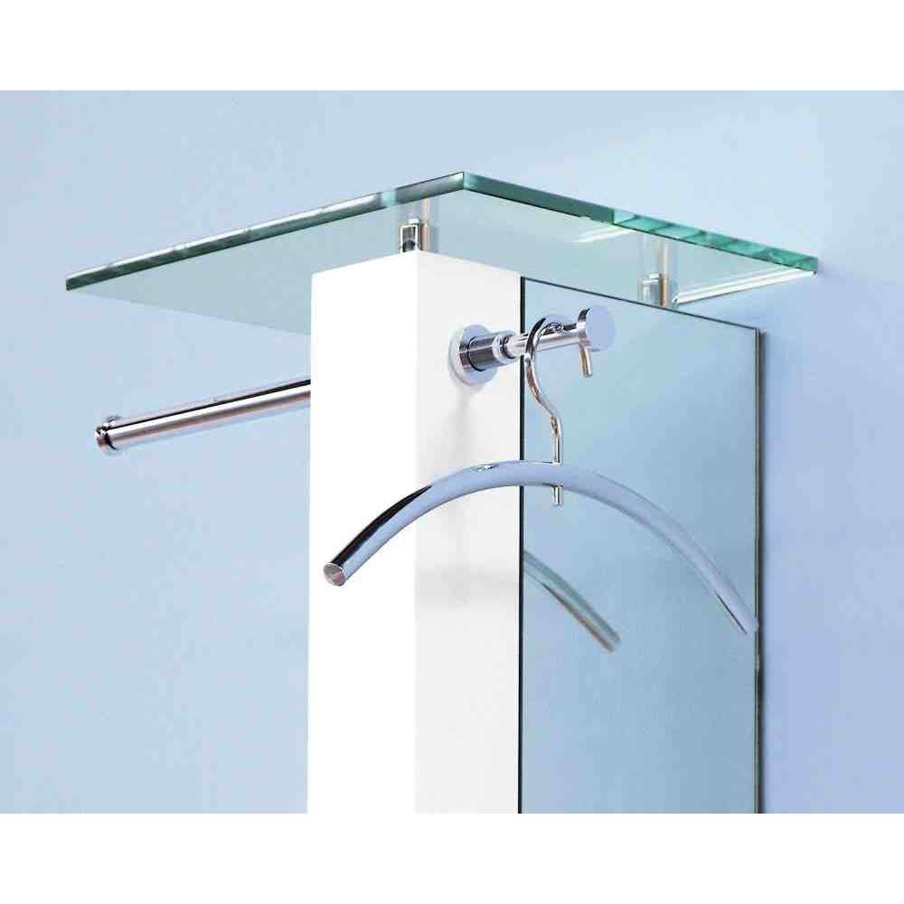 Wieszak ścienny D-TEC MONOLITH umiejętnie łączy kilka funkcji: jest małą szafką z półkami, drążkiem na ubrania, stojakiem na parasole, lustrem i półką na kapelusze w jednym. We wnętrzu MOONOLITH znajdują się szklane półki na szklanki, portfele czy urządzenia mobilne, a także schowek na klucze i podstawka pod parasole. Teleskopowe ramię wysuwane w MONOLITH szybko i elastycznie tworzy dodatkową przestrzeń do przechowywania. Wieszak do wieszania większej ilości ubrań znajduje się na środkowej wysokości ramy. Półka na kapelusze MONOLITH wykonana jest z wytrzymałego bezpiecznego szkła.