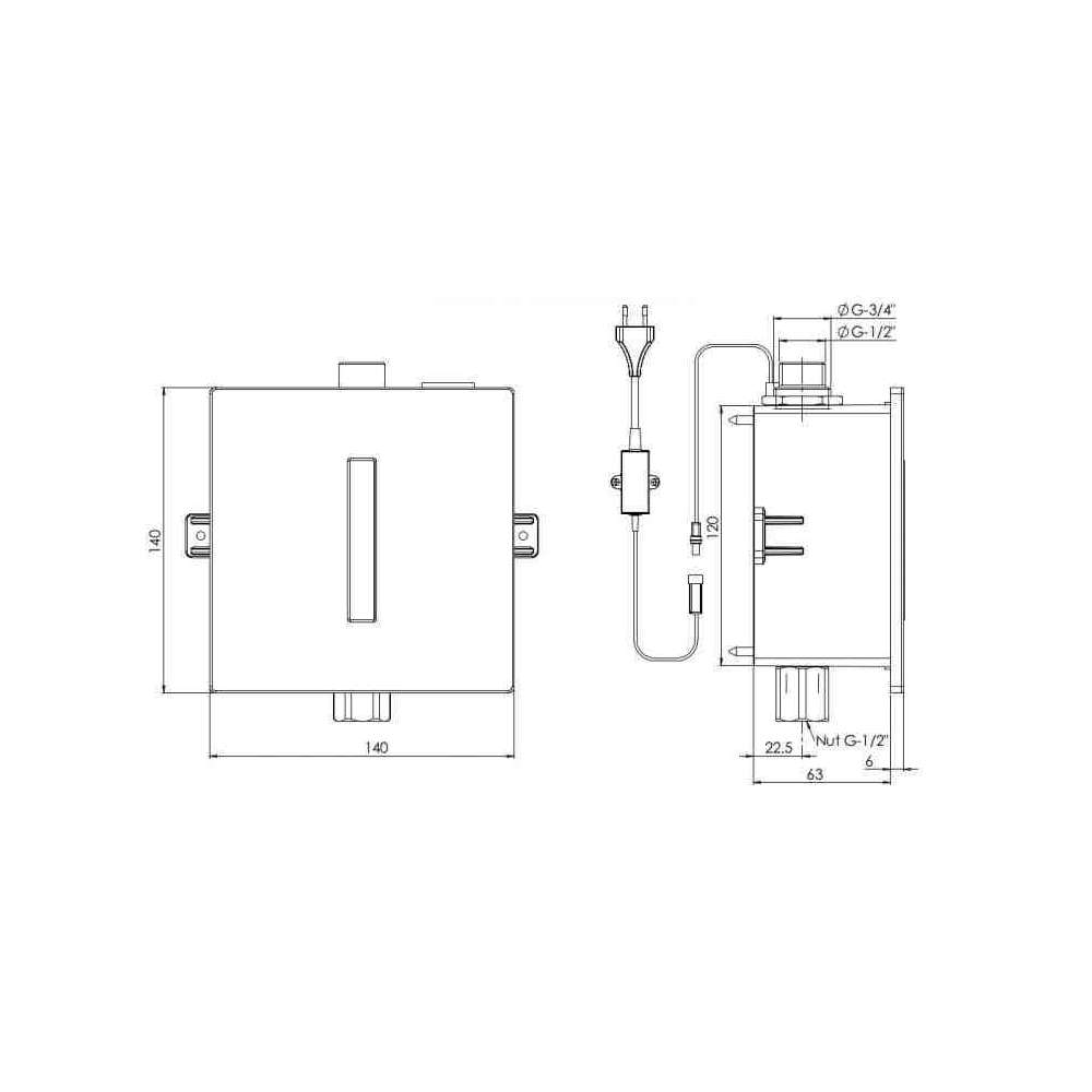 Elektroniczna armatura do pisuaru zasilana przyłączem elektrycznym z transformatorem 9V.