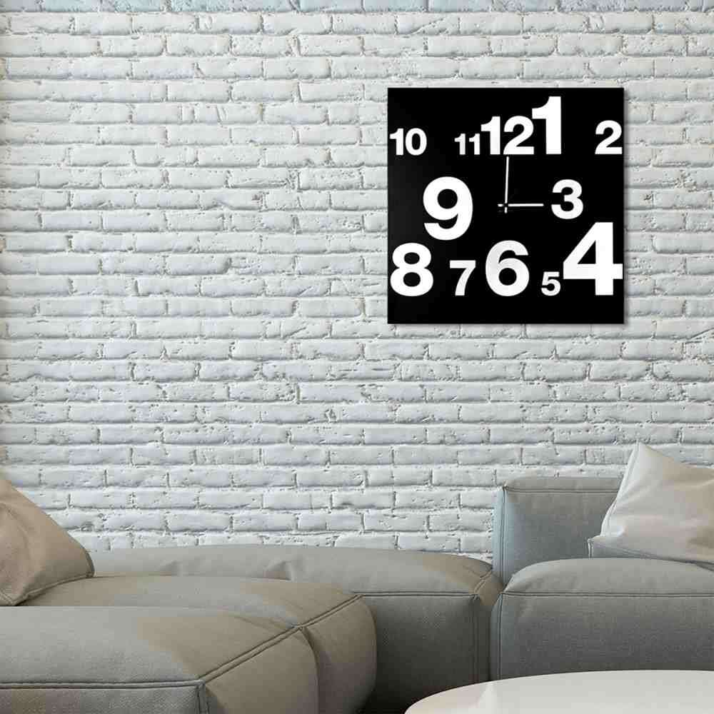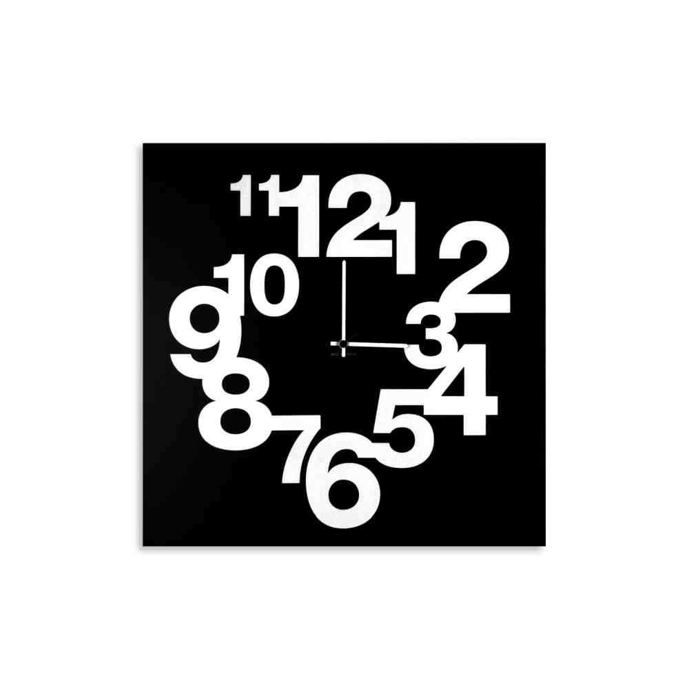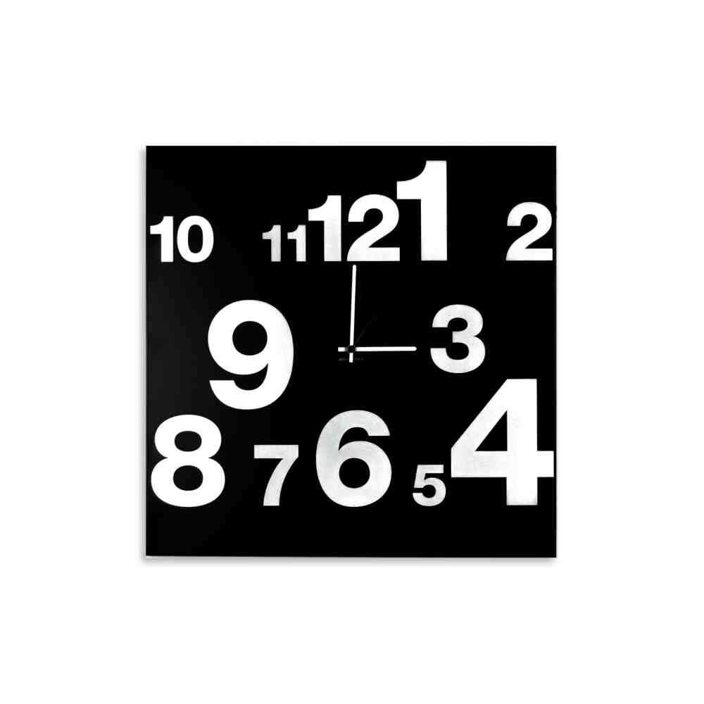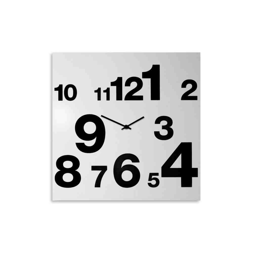 Zegar z cyframi ma kwadratową podstawę z czarnego, malowanego proszkowo żelaza, na której wybijają się cyfry w białych kwadratach, jakby unosiły się z twarzy – być może niezbędny i podstawowy dodatek do domu, ale przez nie znaczy zwykły.