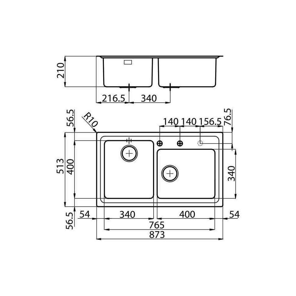 Zlewozmywak można na zamówienie wykonać z dodatkowymi otworami, które można wykorzystać do baterii dwuotworowych, zdalnie sterowanych odpływów lub do zainstalowania dozowników mydła. Pozycje zaznaczono na rysunkach otworami z linii przerywanej.